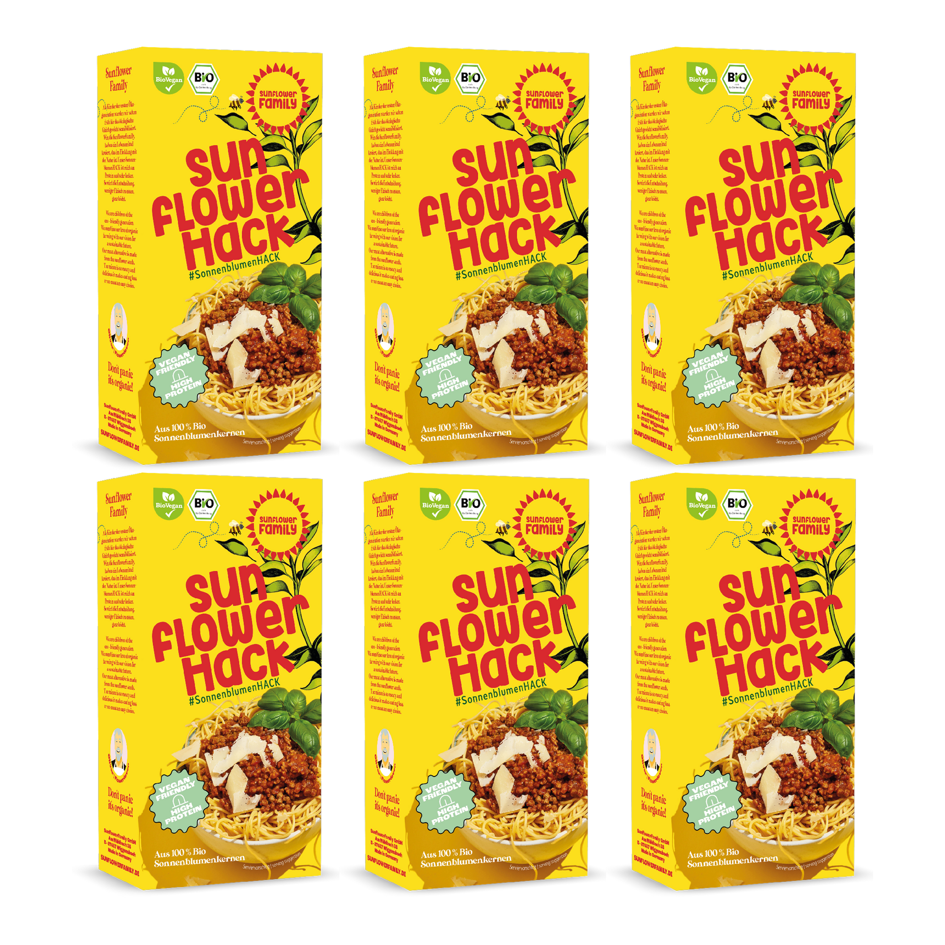 • World novelty: sunflowerFamily Organic sunflowerHACK - the vegan & protein-rich alternative to minced meat and soy. Quick preparation e.g. for bolognese, lasagne or stuffed peppers.