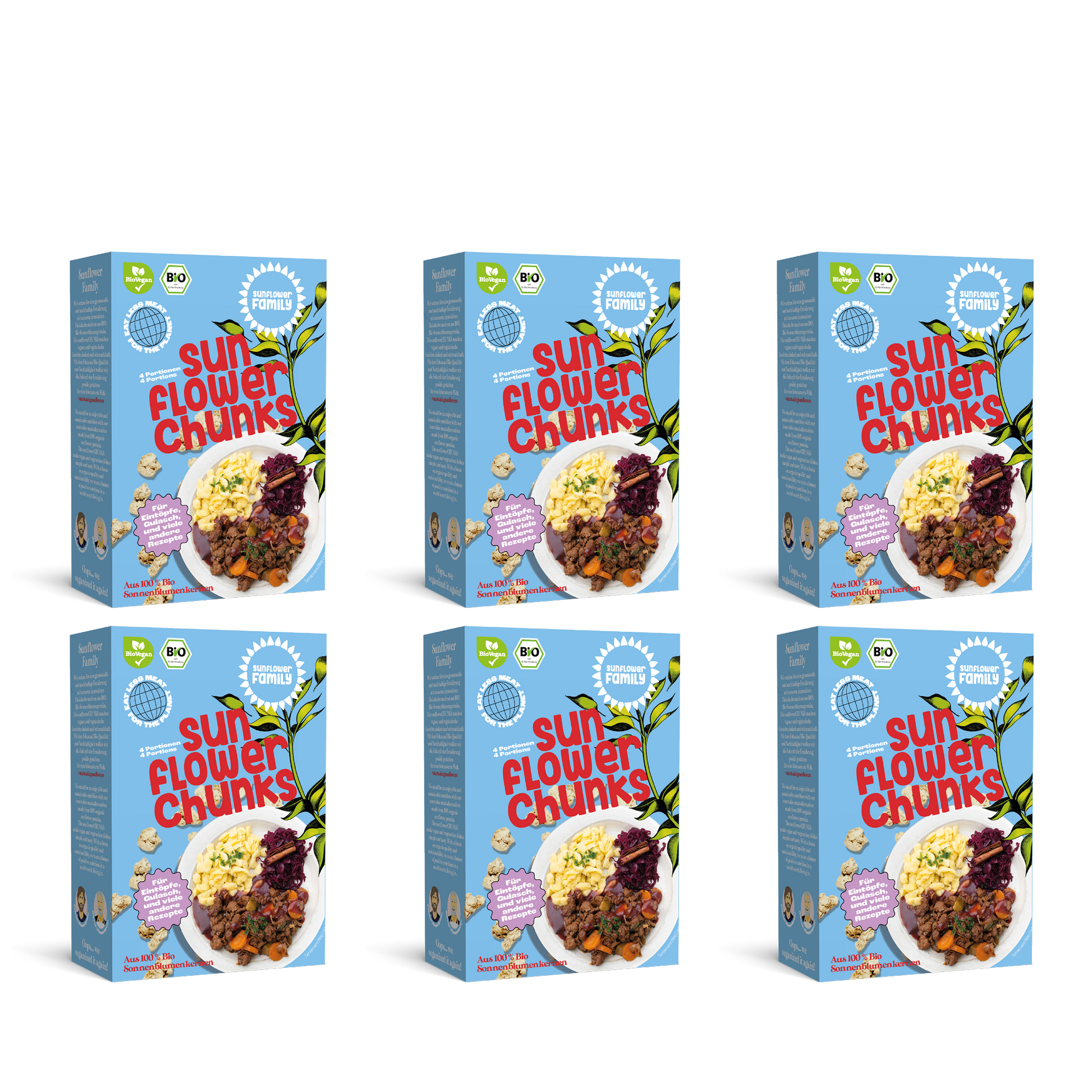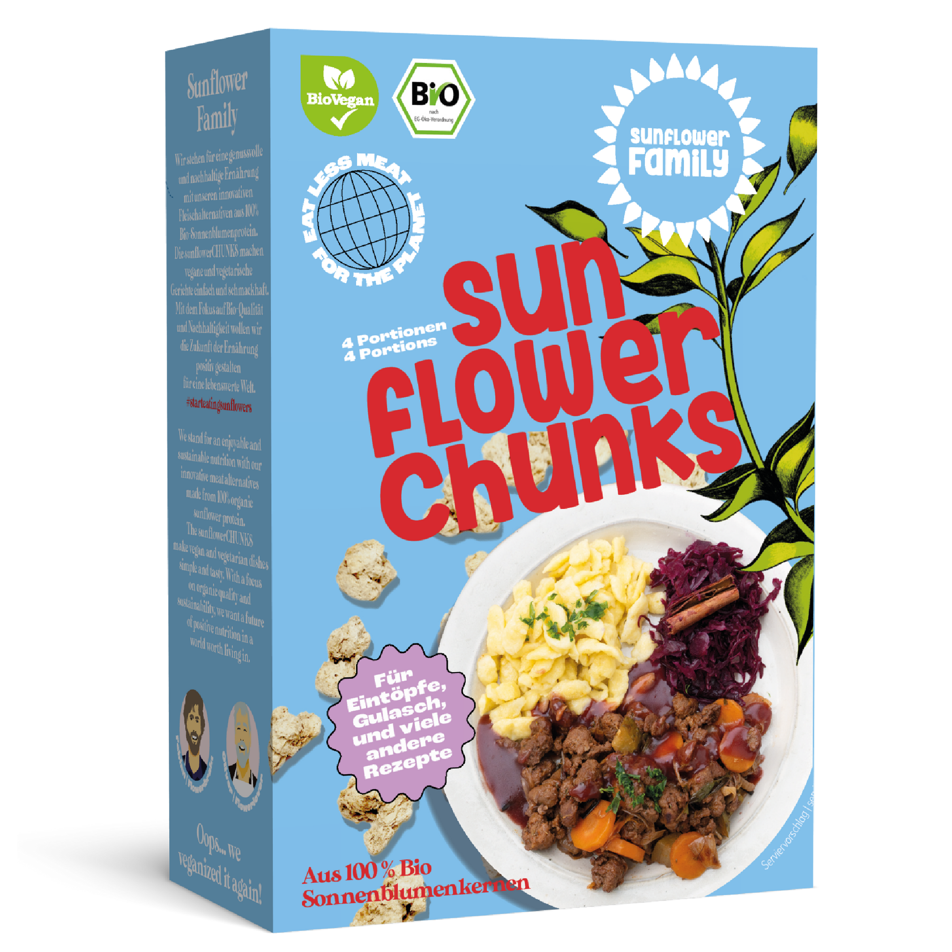 sunflowerCHUNKS sind die perfekte vegane Fleischalternative – 100 % pflanzlich, proteinreich und nachhaltig. Hergestellt aus hochwertigem Bio-Sonnenblumenprotein, ganz ohne Soja, Zusatzstoffe oder künstliche Zutaten.